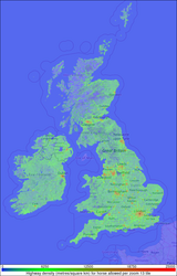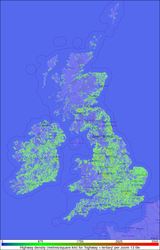 The map statistics are all presented here in the same format. For each one a map is drawn that shows the highway density (measured in metres of highway per square kilometre) within each zoom 13 map tile by colour coding. The full size images (and the quarter size images that link to them below) are created automatically each week from the Routino routing database.