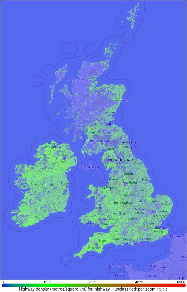 This image shows the density of highways of type UNCLASSIFIED in the Routino UK example database generated from the OpenStreetMap data for the UK. The locations are mapped into a zoom level 13 map tile (2.0x2.0 pixels on this scale) and the colour indicates the density of the particular type of highway measured in metres of highway per square kilometre within the tile.